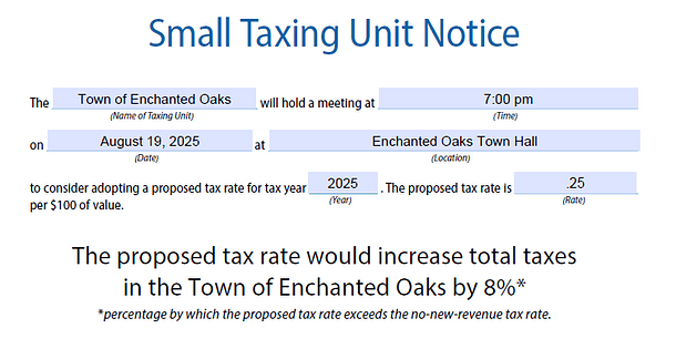 - The Town of Enchanted Oaks, Texas adopted a tax rate that will raise more taxes for maintenance and operations than last year's tax rate. The tax rate will effectively be raised by 8 percent and will raise taxes for maintenance and operations on a $100,000 home by approximately $ 14.66.